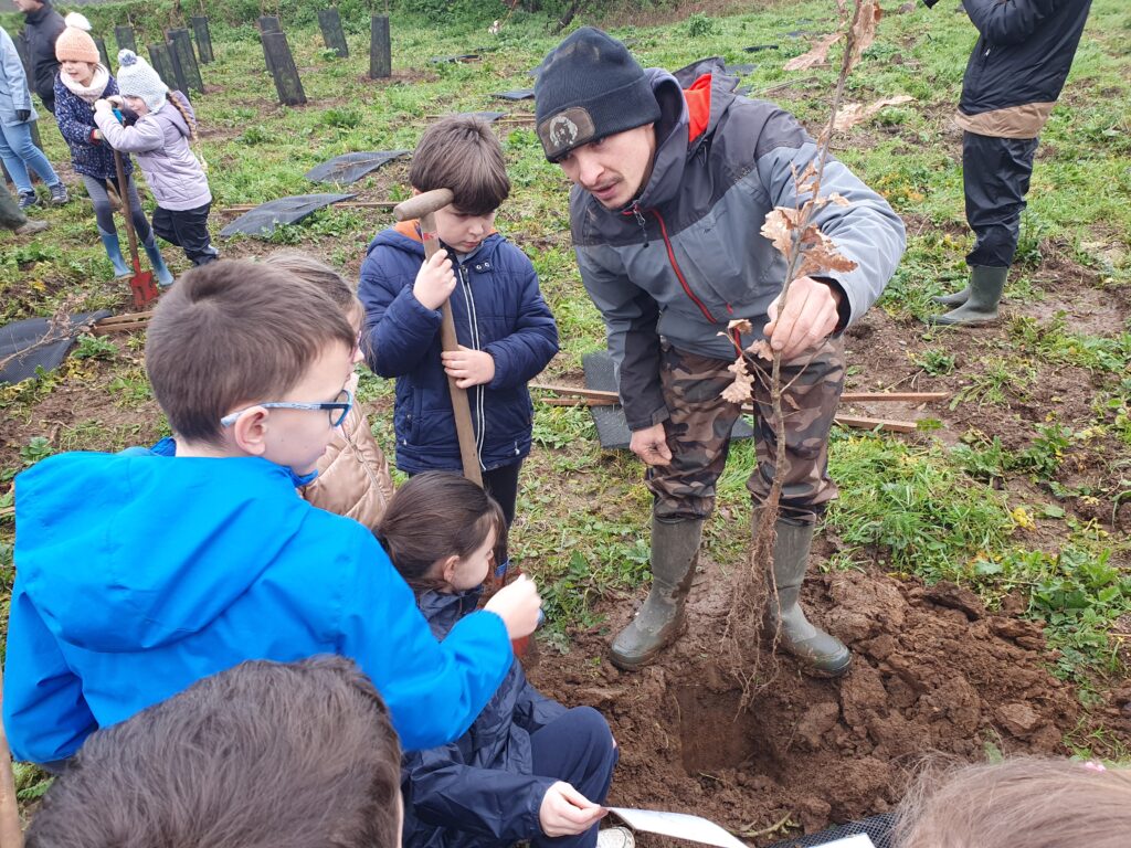 Les enfants se sont ensuite équipés de bêches pour planter les jeunes arbres. Ils ont aussi protégé les plants avec des poches à huîtres déclassées fournies par les ostréiculteurs locaux afin d’empêcher chevreuils et lapins de nuire à la croissance des arbres.