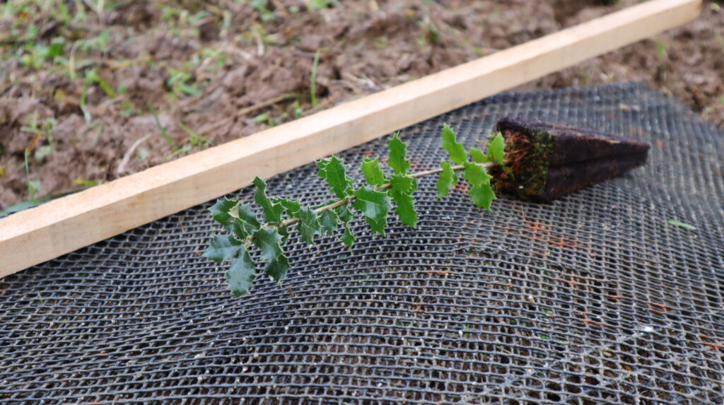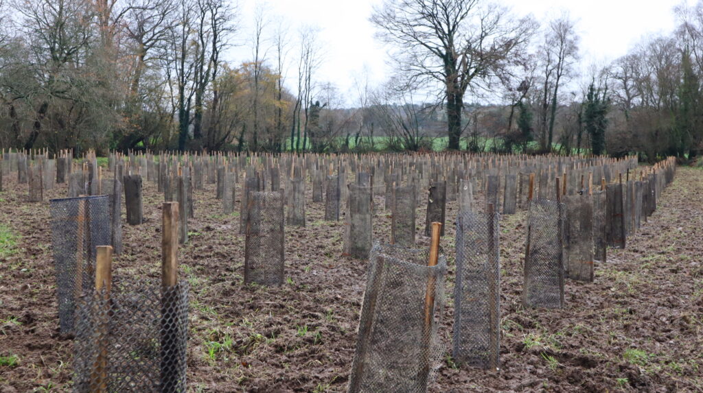 Une étude du sol a été réalisée par Clim’actions Bretagne afin de déterminer le choix des essences. Ce sont quinze essences différentes qui ont été sélectionnées pour la parcelle et validées par notre comité d’experts : Aubépine, Sureau noir, Prunellier, Houx, Saule, Poirier sauvage, Charme, Alisier Torminal, Erable champêtre, Frêne commun, Bouleau verruqueux, Tilleul à petites feuilles, Chêne pédonculé, Chêne sessile et Chêne vert. Cette diversité favorisera la résilience du milieu forestier et sa biodiversité face au changement climatique. Les plants viennent de pépinières bretonnes et sont labellisés « Végétal local »