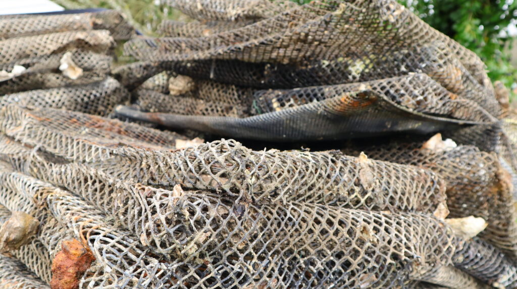Des poches à huitres usagées ont été récupérées auprès d’ostréiculteurs du littoral et ont été utilisées comme solution alternative pour protéger les jeunes plants des dents des chevreuils et des lapins. Ces protections de seconde main ont été découpées et nettoyées par le service technique de la commune et les bénévoles.