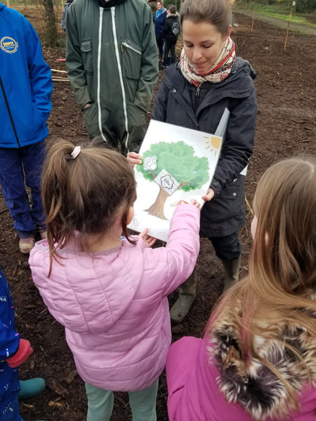Mais avant, il est important de comprendre pourquoi ils viennent planter. Répartis en petits groupes, les animateurs de Clim’actions expliquent aux élèves l’importance et l’utilité de l’arbre, à travers un jeu qui suscite de nombreuses questions de nos petits explorateurs du jour. » A quoi servent les vers de terre ? On va planter que des sapins ? On va planter des pommiers ? » Accompagnées de réflexions pertinentes : « nous n’avons pas besoin de parasol en forêt, car les arbres nous protègent déjà. Les vaches se mettent sous les arbres dans les champs quand il fait trop chaud en été. «