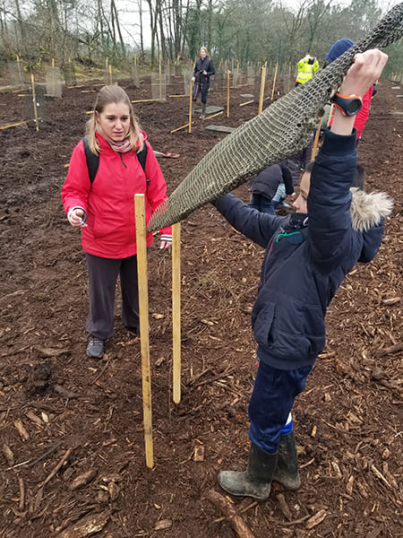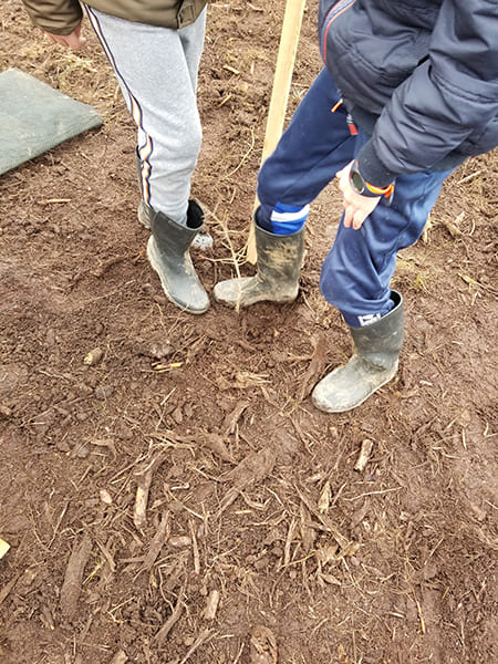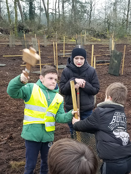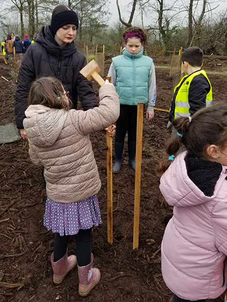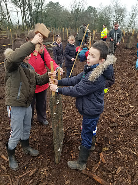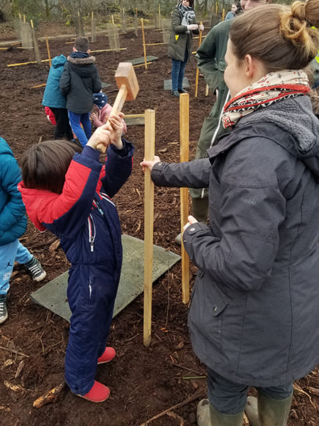 Maintenant les élèves trépignent pour passer à l’action. Quelques règles de sécurité avant de commencer et c’est parti. Leur enthousiasme était débordant, au point de se scinder en tout petits groupes pour planter un maximum d’arbres. Ils ont également dû faire preuve de collaboration, notamment pour se prêter le matériel nécessaire à la plantation (maillets, pelles-bêches).