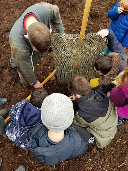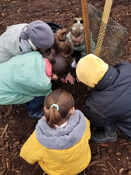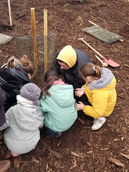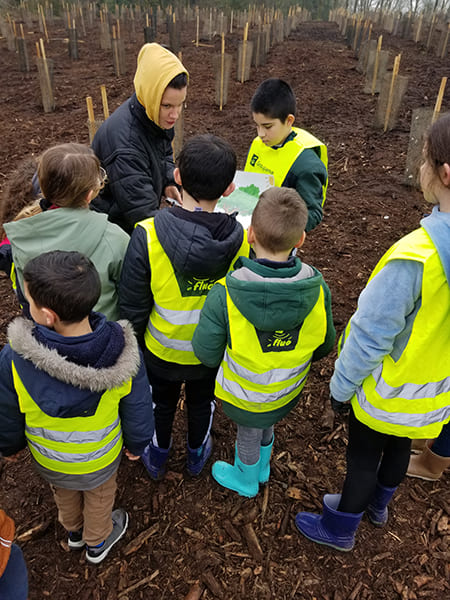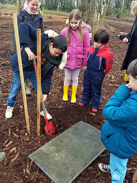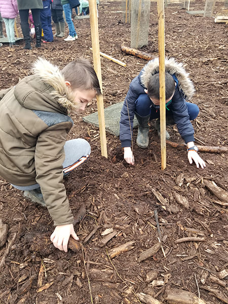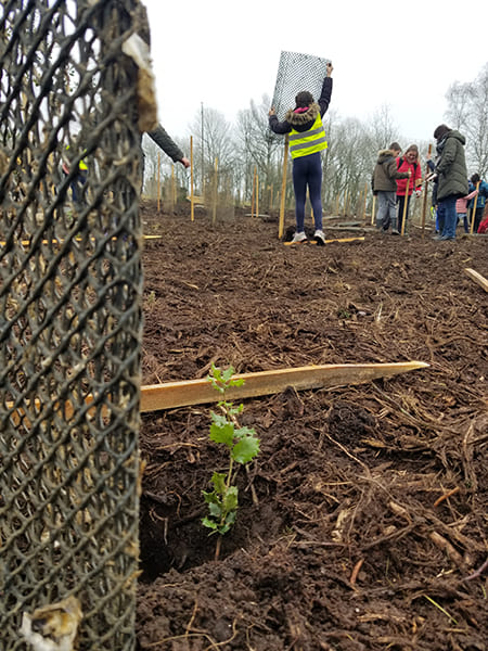 Les élèves, à tour de rôle, plantent et protègent les jeunes plants dans les trous préparés la veille. On ne les arrête plus, mais il faut donner le relais aux copains qui arrivent de l’école Les Quatre Saisons. Avec autant d’enthousiasme, certains donnent des petits noms à leur plant, comme Calvin qui baptise son arbre « Albert Einstein ».