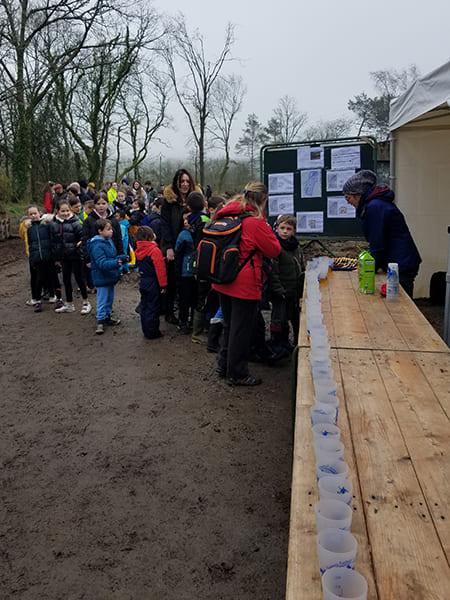 L’équipe de Clim’actions, accompagnée des étudiants en terminales de la MFR, accueillent la première école. Les élèves de l’école Sainte Thérèse arrivent très impatients de planter leurs arbres.