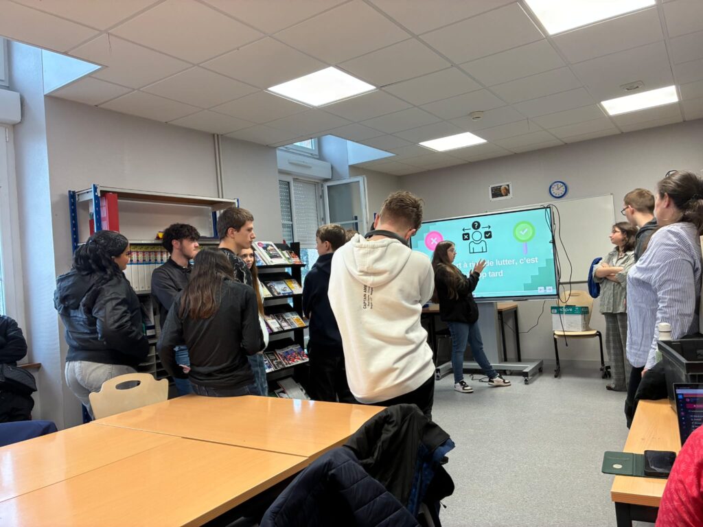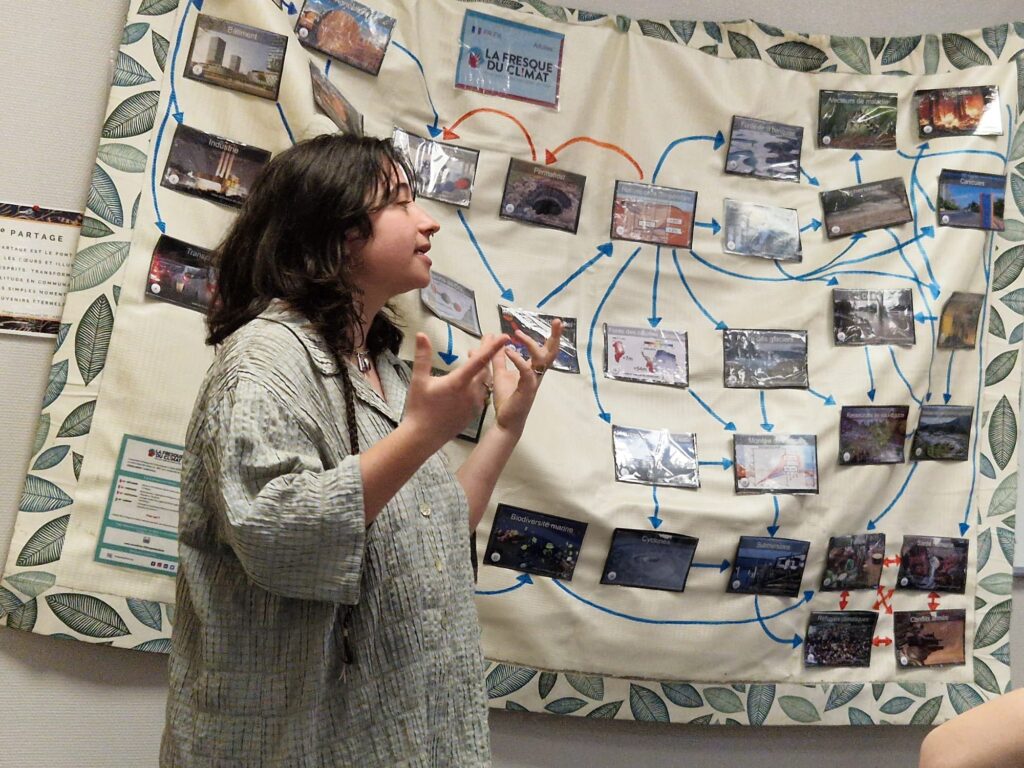 Malgré une pluie diluvienne, il y avait une bonne ambiance dans les locaux de l’Amisep à Vannes. Mathis, Amina, Eliot, James, Maïna, Ilan, Loan, Sarah, Alessio, Nathan, Sullivan, Miléna, Rayan, Raphaël accompagnés de Sophie Cavil (Amisep) et Antonin Nicolaon du SPOT 15/25 ans, se sont retrouvés autour de Léa et Pauline pour échanger ensemble sur le changement climatique, les causes, les conséquences et les moyens d’agir.