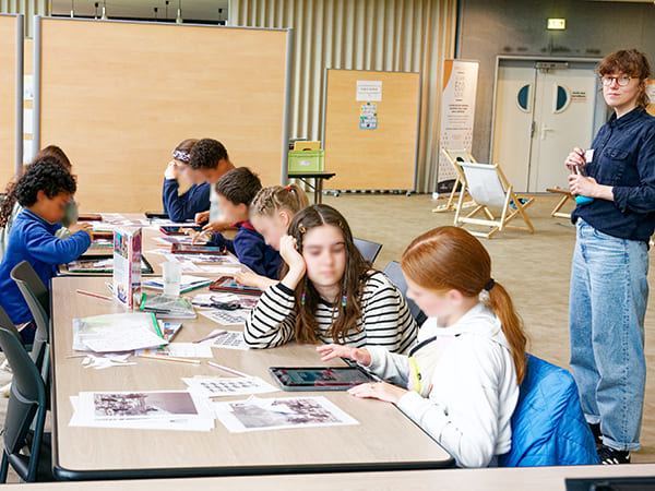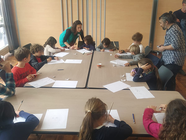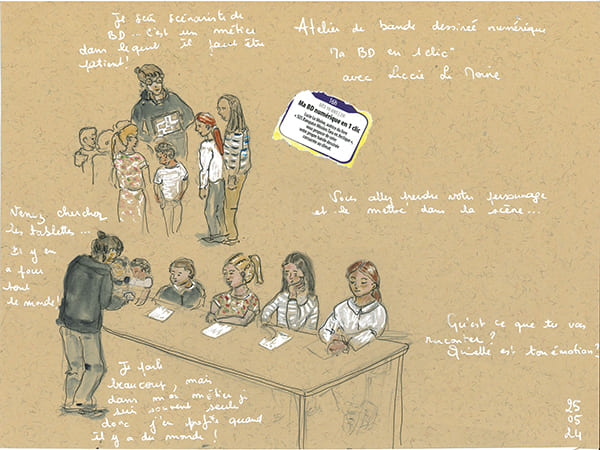 Les enfants, quant à eux, étendaient leur royaume sur de grands tapis qui accueillaient puzzle, coloriages et autres jeux. Tout au long du festival, différents ateliers leurs étaient proposés : faire ses premiers pas de Mangaka avec le professeur de dessin Nicolas Dorléans de l’association Hermine & Sakura, créer des super-héros et héroïnes du climat avec les auteurs David Jambou et Christopher Lannes de l’association des Bédéastes Imageurs, fabriquer une bande dessinée numérique avec l’autrice Lucie Le Moine, découvrir les sciences à travers les mangas de Laura Tanniou, animatrice des Petits Débrouillards Grand-Ouest et enfin, nourrir son imaginaire pour dessiner une société bienveillante et résiliente avec Charlotte Primpied-Bonfillou.