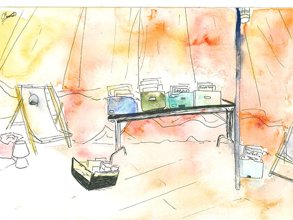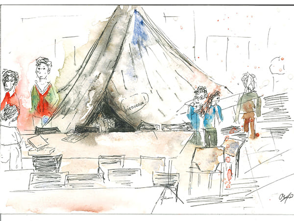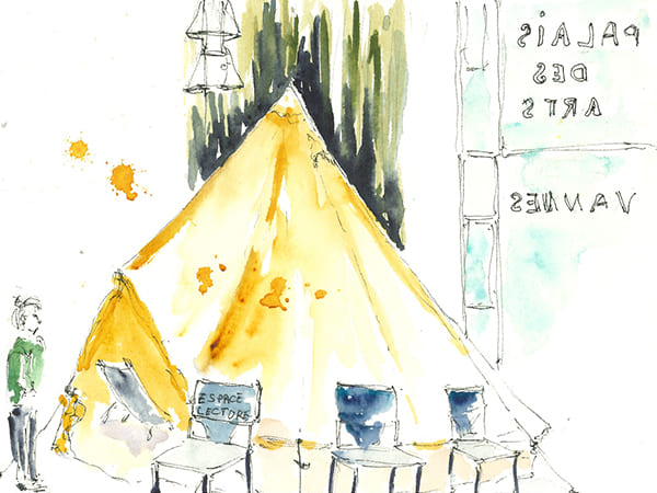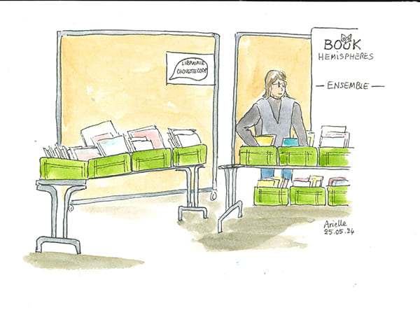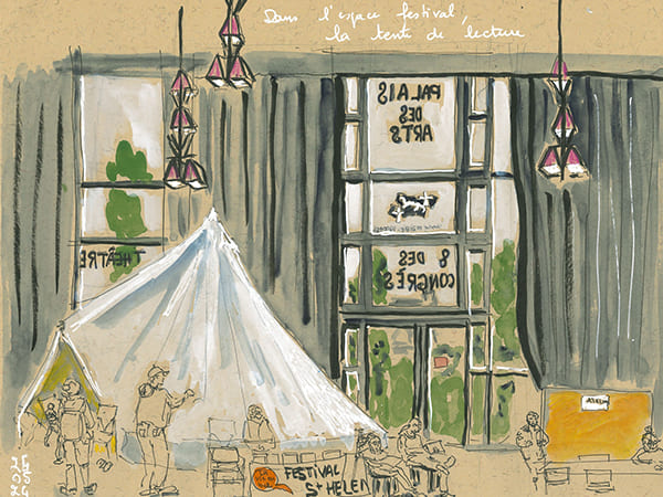 Le Palais des Arts avait été aménagé pour l’occasion : au centre de l’espace Golfe trônait une grande tente pour les visiteurs curieux qui souhaitaient s’abriter du monde extérieur le temps d’une lecture. L’association LaPACH, notre voisine qui organise le festival La Vie en bulles de Sainte-Hélène, gardait l’entrée avec un stand de bandes dessinées documentaires. L’organisation ChouetteCoop, actrice de l’économie sociale et solidaire, était également présente avec ses bandes dessinées d’occasion.