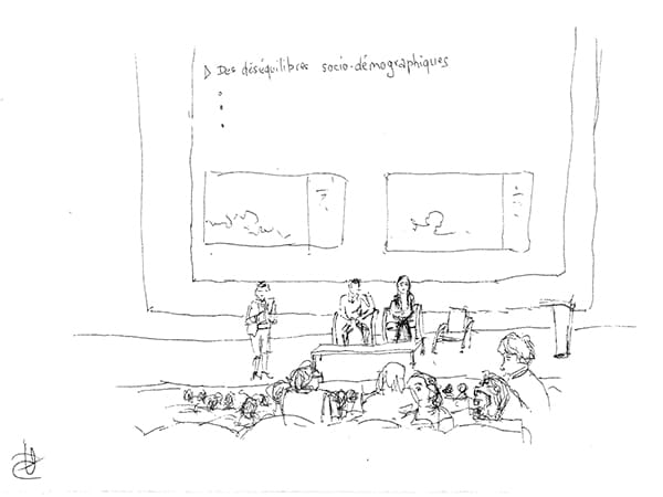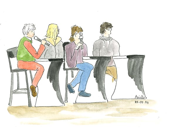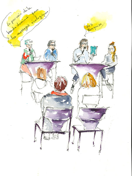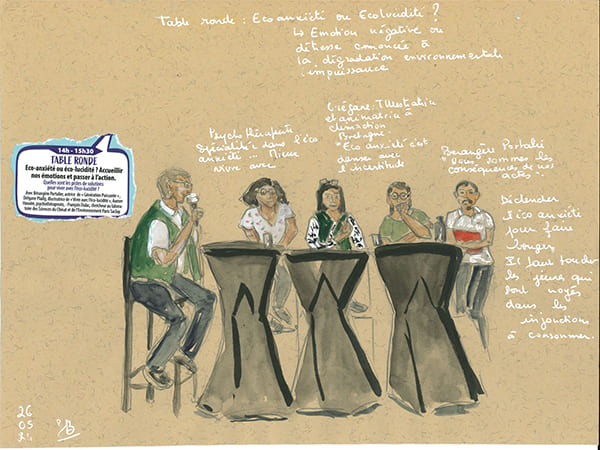 Dimanche 26 mai à 14h, nous avons abordé le thème de l’éco-anxiété – ce mal qui prend de l’ampleur dans notre vocabulaire et qui révèle la prise de conscience des conséquences du changement climatique – avec la psychothérapeute Aurore Haxaire, l’autrice Bérangère Portalier, l’illustratrice Orégane Plailly et le chercheur du LSCE François Dulac.