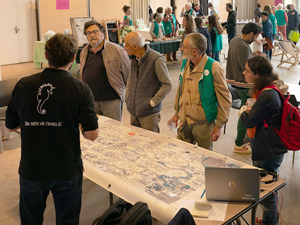 Après l’exposé passionnant d’un doctorant sur les limites planétaires et la présentation d’un diagnostic du territoire, le public a été invité à réfléchir en sous-groupes aux enjeux de transition du prochain plan d’aménagement SCot-AEC : mobilités, logement, alimentation, énergie, carbone… Une belle moisson d’idées pour penser l’avenir à l’horizon 2050 !