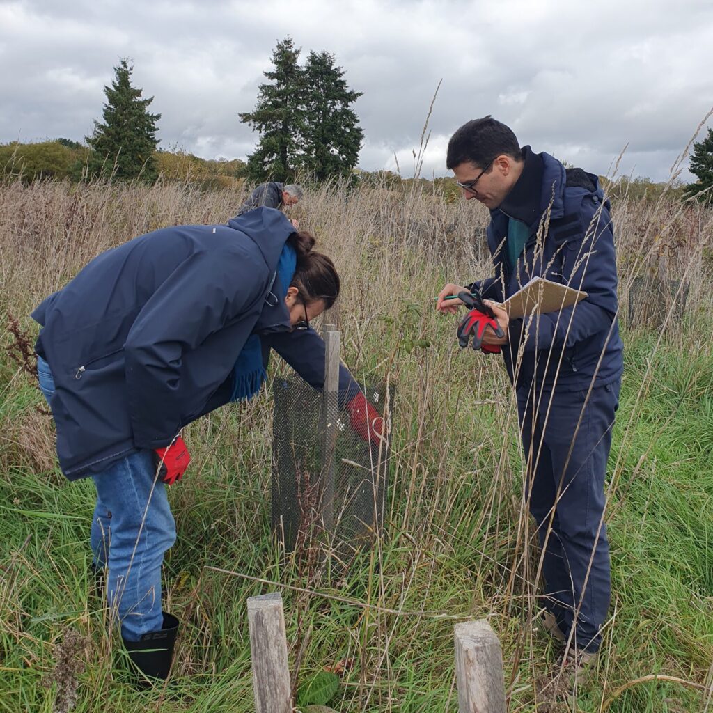 Pendant toute la journée, l’équipe salariée de Clim’actions Aline Velot, Juliette Le Cagnec, Léa Frémont et Jean Luc Bisch en tant qu’expert forestier bénévole à Clim’actions, ont accompagné les salariés à réaliser le suivi de croissance des 800 plants. Muni d’un crayon, d’un support papier pour relever les observations demandées (nom de l’essence planté, hauteur et diamètre de l’arbre, mort, vigoureux ou peu vigoureux, maladies constatées, état de la protection…) et d’un guide d’aide à l’identification, les salariés d’Interdigital se sont bien prêtés au jeu.