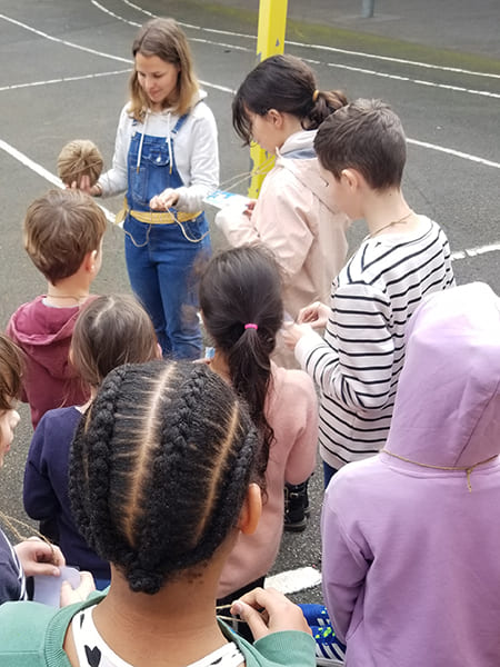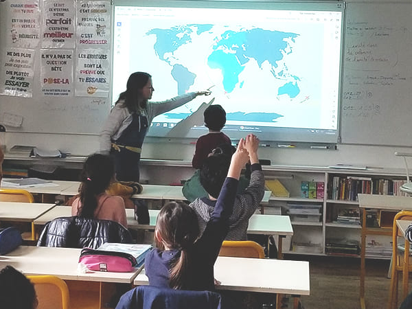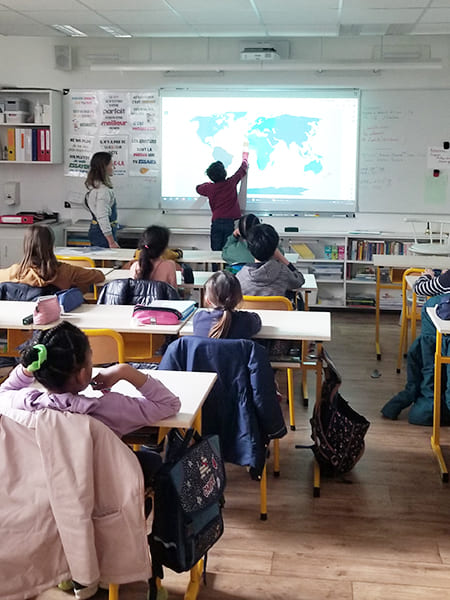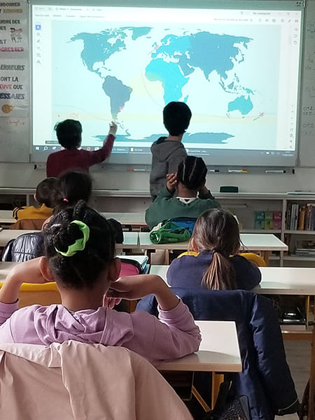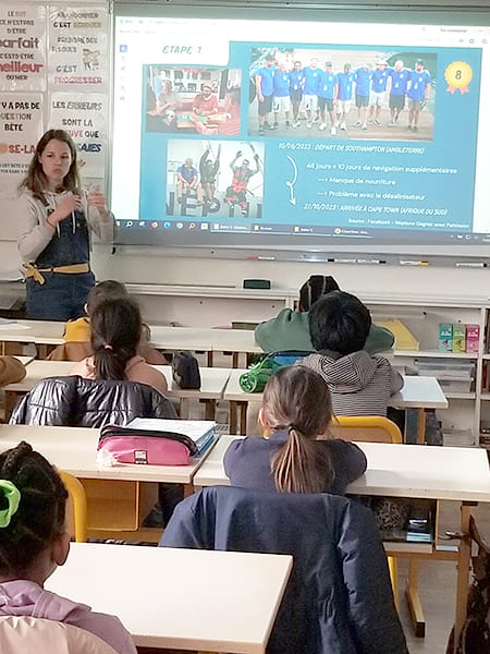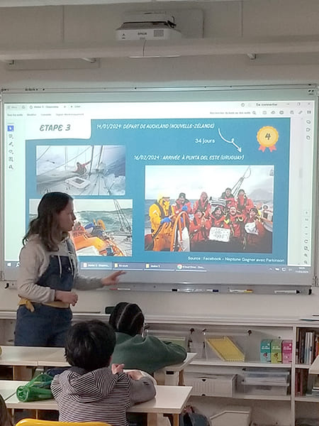 Pour ce troisième atelier, Juliette Le Cagnec de Clim’actions Bretagne retrouve les trois classes de l’école Sévigné de Vannes. Comme à chaque fois, les élèves ont hâte d’avoir des nouvelles de l’équipage Breton, engagé dans la course Ocean Global Race, à bord du Neptune.