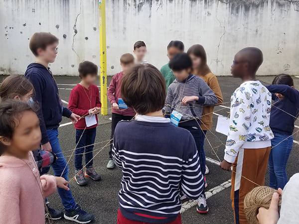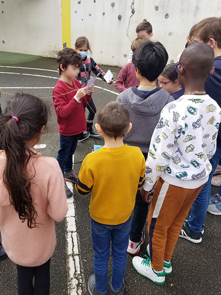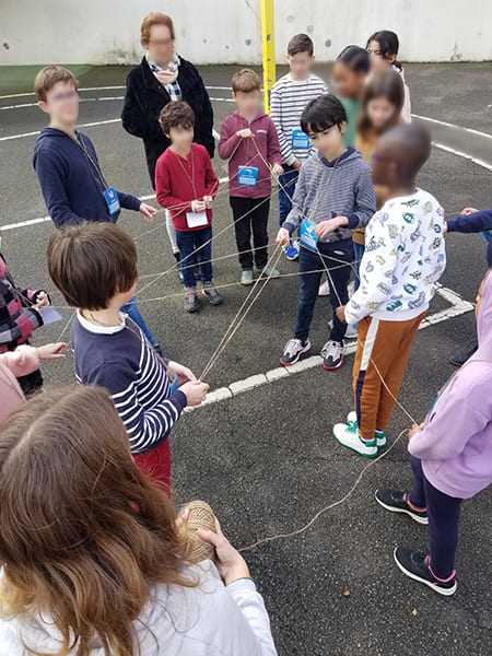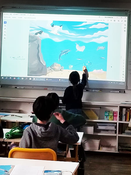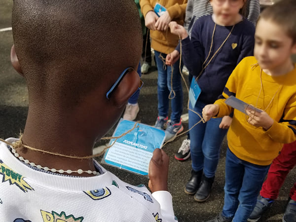 Pour bien comprendre le fonctionnement de la chaîne alimentaire, les élèves sont invités à aller dans la cour de récréation. Chacun représente un être vivant (phyto ou zoo plancton, crevette, dauphin, etc.). Aidé par une petite carte d’identité, les élèves lisent et comprennent les liens vitaux entre chaque espèce. Mais que se passe-t-il si on enlève un élément de cette chaîne alimentaire marine ? Les élèves se retrouvent tous accroupis, certains s’interrogent : « mais, si nous avons tous disparu, il n’y plus rien dans la mer ! » .
