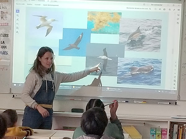 La biodiversité est de ce fait l’ensemble des êtres vivants sur Terre. Les élèves écrivent la définition de sur leur feuille, avant de découvrir les espèces que les marins du Neptune ont pu observer : les dauphins, les baleines, les poissons, les oiseaux ou les algues, « les marins du Neptune ont pêchés des poissons pour se nourrir ? ».