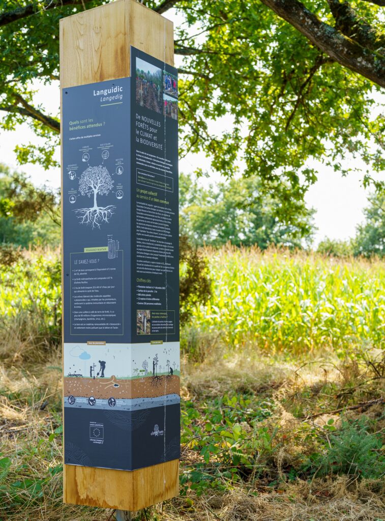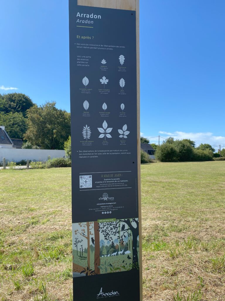 Dans le cadre d’un projet co-financé à 60% par l’Union européenne (programme FEDER), Clim’actions Bretagne réalise un panneau pédagogique pour chacune de ses plantations sous forme de totem sur 3 faces inscrites.